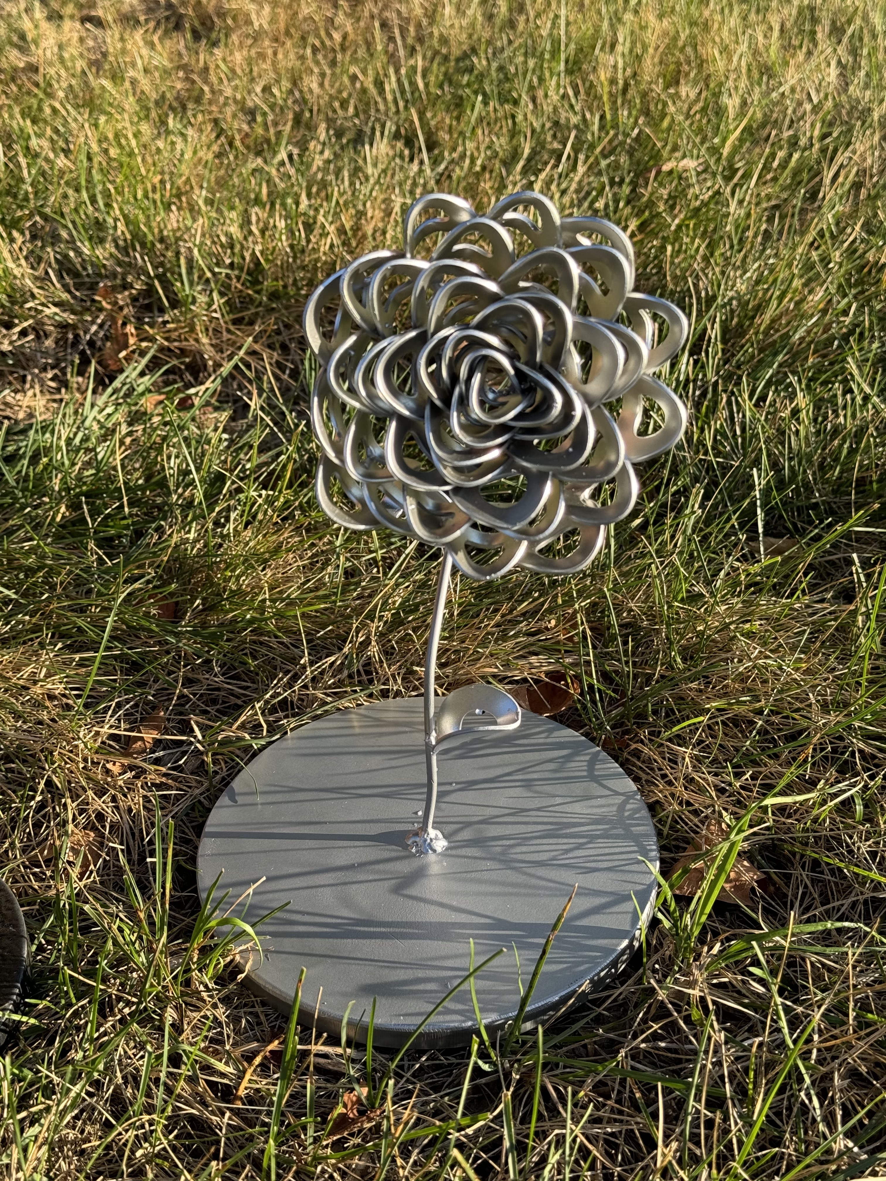 Metal petals are derived from recycled and raw material. Whatever isn’t used or trashed, is made into the pieces you see. Not only are they recycled and up-cycled, but they are sustainable. They do not harm the earth and they last forever.